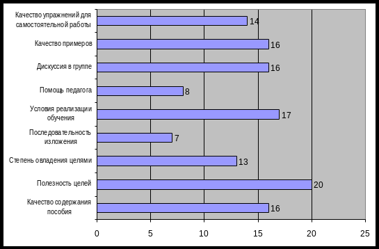 Из данных рисунка 1 мы можем сделать следующий вывод. Студентами ПУ-49 в целом высоко оценен курс «Технология проектного метода в обучении экономике». Наиболее значимые результаты ответов можно отметить по следующим позициям: полезность целей курса – 20 ответов, условия реализации обучения – 17. Одинаковое количество ответов (16) набрали следующие позиции: качество примеров, дискуссия в группе, качество содержания пособия. Наименьшие результаты отмечаются по позициям ответов: последовательность изложения (7), помощь педагога (8). Педагогам и воспитателям ПУ-49 стоит обратить внимание на данные пункты и в будущем уделить внимание разработке именно этих сторон проекта.