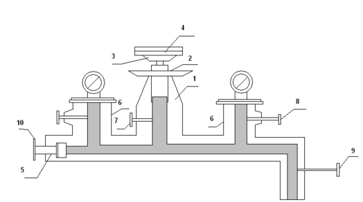 1 – вертикальный цилиндр; 2 – стальной поршень; 3 – тарелка; 4 – груз; 5 – винтовой поршневой пресс; 6 – штуцер; 7,8,9 – вентиль; 10 – маховик