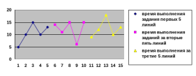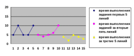 При определении количественных показателей учитывается время, затраченное исследуемым на нахождении линий. Фиксируется время, за которое исследуемый находит окончание каждой линии по порядку (с 1 по 5, с 6 по 10 и т.д.). Это дает возможность следить за влиянием упражняемости на выполнение задания исследуемым. Для каждого исследуемого строится график зависимости количества ошибок, просмотренных линий, и кривая упражняемости или утомляемости, где показателем выступает время, затраченное на нахождение каждых 5-ти линий.