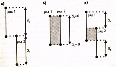 Рис. 2 Возможные соотношения рядов значений в двух выборках; S1 - зона значений 1-го ряда, которые выше максимального значения 2-го ряда; S2 - зона значении второго ряда, которые меньше минимального значения 1-го ряда; штриховкой отмечены перекрещивающиеся зоны двух рядов
