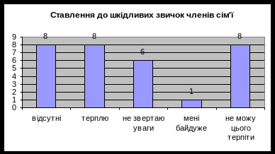 Велика частина опитаних дуже нетерпеливо відноситься до шкідливих звичок своїх членів сім’ї, і з цього починається конфліктна ситуація, коли висуваються певні претензії, докори і невдоволення.