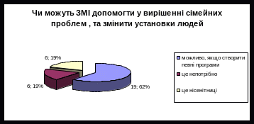 Більшість респондентів вважають, що засоби масової інформації можуть вплинути на стереотипи сім’ї і якщо створити певні програми, то можна отримати позитивний результат в боротьбі з конфліктністю.