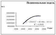 Одна из главных задач изучения динамических рядов состоит в выявлении закономерностей (тенденций) в развитии того или иного процесса или явления. Исходя из данных, полученных в результате анализа ряда динамики численности населения столицы, можно отметить, что она продолжает расти. Значения цепных и базисных показателей показывают нам характеристику изменений уровней динамического ряда. В частности, можно отметить резкое снижение значения цепного абсолютного прироста в 2004 году, а также стремительный рост показателей абсолютных базисных приростов. Последнее свидетельствует о том, что численность г Москвы продолжает возрастать. Показатели цепных темпов роста показывают, что текущая численность населения города в период 2000-2005 гг. шла на убыль. Средний темп роста населения столицы составил 100,9%, в то время как средний темп прироста составил 0,9%.