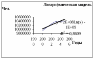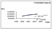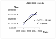 Рассмотрим линейную модель, чтобы сделать прогноз численности населения на 2006-2007 гг. Для этого возьмем линейное уравнение: y = 94772*x + 2E+0,8. Число 2Е+0,8 ≈ 10000000. Обозначим года: