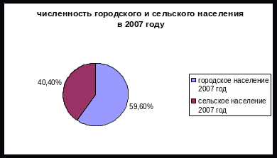 Как видно из рисунка 2, численность городского населения составляет 59,6%, а сельского - 40,4% из всей численности населения 2007 года. Численность городского населения в 2007 году превышает численность сельского населения на 19,2%.