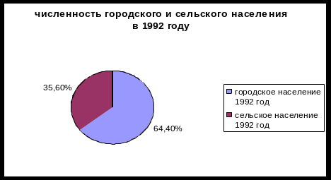 На рисунке 1 приведено процентное соотношение численности городского и сельского населения в 1992 году. Из рисунка видно, что численность городского населения в 1992 году составляет 64,4% из всей численности населения 1992 года и превышает численность сельского населения на 28,8% (численность сельского населения, как видно из рисунка – 35,6%).
