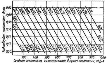 По графіку (рис. 5.1.) встановлюємо, що водотверде відношення газосилікату (В/Т) при о.г=600 кг/м3 складає 0,52, витрата алюмінієвої пудри – 0,175% маси матеріалів.