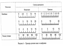 Деление шкалы является важным средством улучшения идентификации значений шкалы Деления должны соответствовать требуемой точности измерений и точности передачи информации. Трехступенчатое деление больше не должно применяться (длинные, средние и короткие линии) Между двумя длинными линиями нельзя размещать более четырех средних линий (т. е. пяти промежутков) и более четырех коротких линий (т. е. пяти промежутков) между двумя средними линиями. Кратность между двумя короткими линиями может быть 1, 2, 5, 10. Возможность идентификации при различных способах деления не всегда удовлетворительна. На рисунке 6 даны примеры правильного деления шкал.