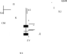 На рис. 1 изображена САР угловой скорости двигателя внутреннего сгорания (дизеля) с внутренней изодромной обратной связью. Здесь: Д -дизель; МП –механическая передача; ЦБМ - центробежный маятник; ГУ –гидроусилитель; СМ –сервомотор; К –катаракт; П –пружина.