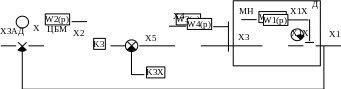 где - ошибка регулирования; ki- коэффициенты усиления; Ti-постоянные времени; хзад- заданная угловая скорость; х1- угловая скорость дизеля; х2-перемещение муфты ЦБМ; х3- перемещение рейки топливного насоса; х4- перемещение цилиндра катаракта К; х5- перемещение золотника ГУ; МН- момент нагрузки на валу двигателя.