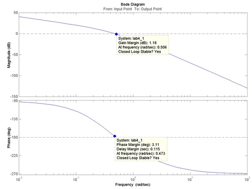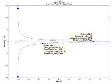 Рис. 6. АФЧХ САР угловой скорости двигателя внутреннего сгорания (дизеля). Численные значения запасов устойчивости, полученные по АФЧХ.