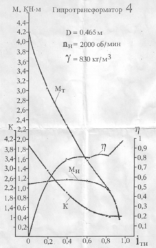 Для каждого выбранного значения передаточного отношения гидротрансформатора определяем значение крутящего момента на валу турбины и число оборотов этого вала, соответствующее найденному значению крутящего момента. Расчет проводится по формулам