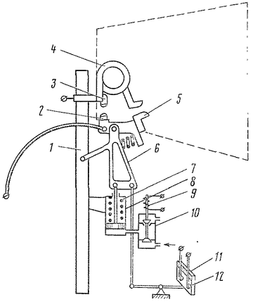 контактом 10. На кронштейне 6 подвижного контакта шарнирно установлен рычаг 8 держателя 7 с контактом 9. Рычаг связан изоляционной тягой 5 со штоком пневматического привода.