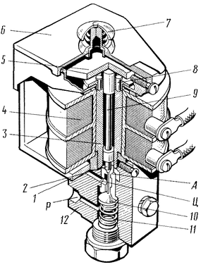 Вентиль включающего типа состоит из корпуса 1 (рис. 1), которым он прикреплен к соответствующему аппарату. Корпус имеет отверстия, ведущие: Р — к резервуару сжатого воздуха, Ц — к цилиндру аппарата и А — к атмосфере. Внутрь корпуса запрессована бронзовая втулка (седло) для клапанов 2 и 10. При возбуждении катушки якорь 5 под действием магнитного потока поворачивается относительно острой грани ярма 12 и нажимает на ствол 9 выпускного клапана 2. Последний своей притирочной поверхностью прижимается к седлу и отсоединяет цилиндр привода от отверстия А, т. е. от атмосферы. Одновременно с этим выпускной клапан 2 давит на ствол впускного клапана 10, преодолевая сопротивление пружины 11. Сжатый воздух поступает через отверстие Р в пространство между притирочными поверхностями впускного клапана и седла и через отверстие Ц в цилиндр привода аппарата.