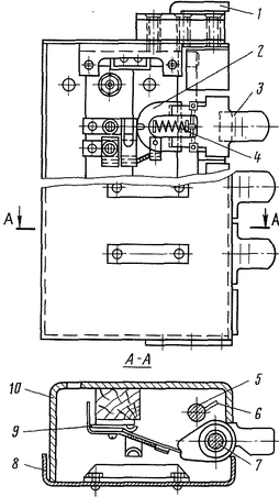 Выключатели монтируют в корпусе 10 (рис. 2) со съемным щитком 8. Рукоятки 3 расположены на общей оси 7. Подвижные контакты 2 имеют дугообразную форму. Внутри дуги установлены пружины 4. Подвижные и неподвижные 9 контакты соединены с выводными клеммами.