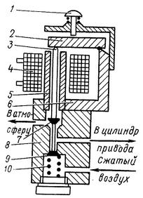 При прекращении питания катушки 4 пружина 11, преодолев вес обоих клапанов и якоря, отжимает их кверху, вследствие чего доступ сжатого воздуха в цилиндр аппарата прекращается. Отверстие Ц соединяется при этом с отверстием А, и сжатый воздух из цилиндра аппарата выходит в атмосферу.