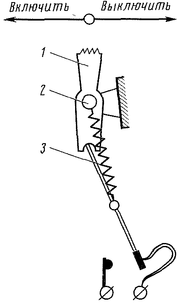 Рукоятка 1 (рис. 1) каждого выключателя сидит на оси 2, общей для всех выключателей. Подвижной и неподвижный контакты соединены с выводными зажимами. Пружина 3 обеспечивает фиксированное положение выключателей, создает необходимое контактное нажатие и перекидывает подвижной контакт из одного положения в другое с большой скоростью независимо от того, с какой скоростью машинист перемещает рукоятку. Большая скорость замыкания и размыкания предотвращает длительное горение дуги и тем самым подгар контактов.