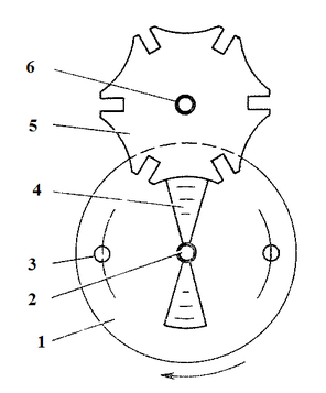 Следовательно, необходимо, чтобы кулачковый вал вращался неравномерно при равномерном вращении приводного двигателя. Это и обеспечивает специальный редуктор, в котором передача выполнена с использованием так называемого мальтийского креста. На ведущем валу 2 (рис. 6) посажен диск 1 с двумя поводками — цевками 3 и фиксаторами 4 положения мальтийского креста 5, посаженного на ведомом валу 6. В начале вращения ведущего вала, пока поводок не вошел в прорезь мальтийского креста, ведомый вал остается неподвижным, его положение фиксируется специальным профилем креста и фиксатором. Далее поводок, войдя в прорезь — «зацепившись», будет поворачивать мальтийский крест, причем с неравномерной скоростью. Наибольшая частота вращения ведомого вала при равномерном вращении ведущего будет, когда поводок приблизится к ведомому валу, т. е. когда займет верхнее положение.