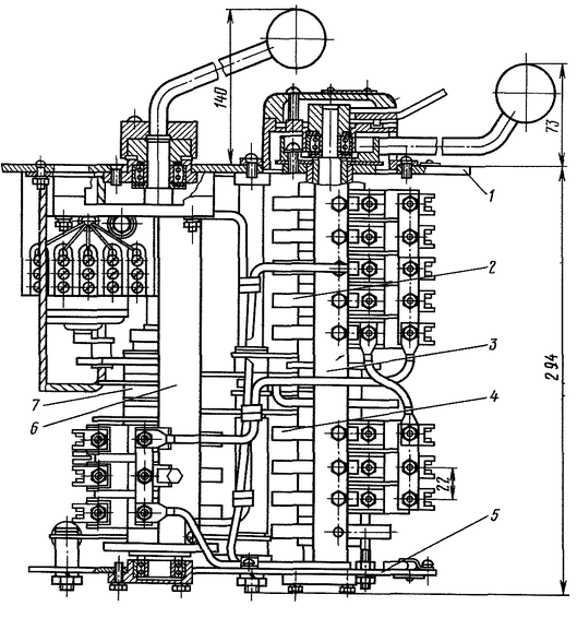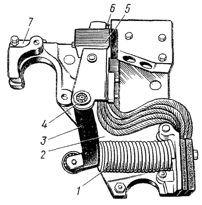 Детали контакторного элемента без дугогашения, как и элемента с дугогашением, собраны на боковине 2 (рис. 4). Пружина 1 отжимает рычаг 3 в направлении поворота его вокруг оси 4 по часовой стрелке, что приводит к замыканию подвижного контакта 6 с неподвижным. Компенсатор 5 играет такую же роль, как и в контакторе с дугогашением. Крепление всех контакторных элементов унифицировано. Винтом хомут 7 прижимается к верхней рейке контроллера, обхватывая ее. Нижняя часть контактора опирается на нижнюю рейку контроллера и снизу крепится хомут (на рисунке не показан).