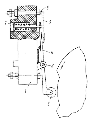 Блокировочные контакторные элементы (блок-контакты) осуществляют замыкания и размыкания в цепях управления на заданных позициях контроллера под током при напряжении 50 В. Поскольку при такой небольшой мощности возникающая дуга (точнее, искрение) быстро гаснет, то на блок-контактах нет необходимости предусматривать устройства для гашения дуги. Конструкция этих элементов несложна. На изолированном основании 1 (рис. 5) жестко укреплен неподвижный контакт 6, на оси 3—рычаг 4 с держателем 5 подвижного контакта. Рычаг состоит из двух частей, что обеспечивает притирание контактов при их замыкании. Сжатая пружина 7 стремится повернуть рычаг против часовой стрелки, т. е. замкнуть контакты. Однако будут контакты замкнуты или разомкнуты, зависит от того, в каком положении находится кулачковая шайба. Если под роликом 2 находится впадина кулачковой шайбы, контакты будут замкнуты, если — выступ, то разомкнуты.