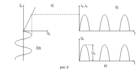 повторяет форму входного напряжения Е(t). В течение другой половины периода диод закрыт и напряжение на выходе выпрямителя равно нулю. Из трафика (рис. 4в) видно, что выходное напряжение сильно пульсирует. Одним из основных параметров выпрямителя является коэффициент пульсаций К