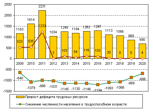 Рисунок. Снижение численности населения в трудоспособном возрасте в России, тысяч человек.
