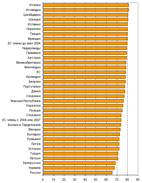 Рисунок. Ожидаемая продолжительность жизни для обоих полов в европейских странах.
