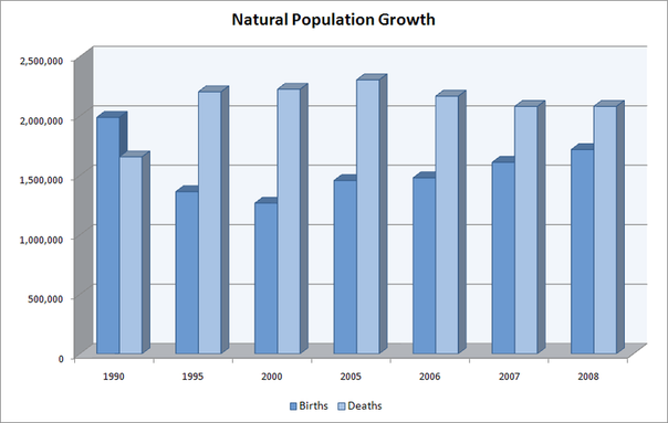 Рисунок. Россия, рождений и смертям 1990-2008 гг.