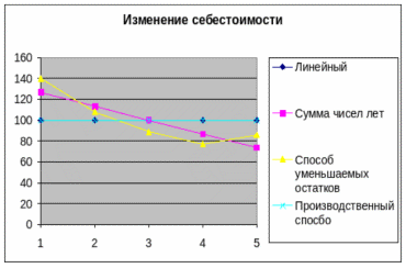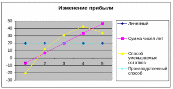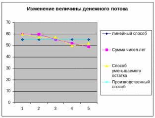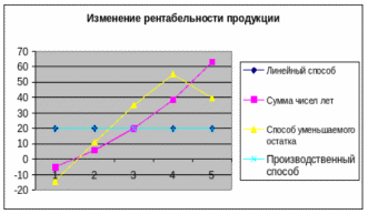 При использовании линейного способа начисления амортизации вышеперечисленные показатели остаются на прежнем уровне в течение всех пяти лет. В данной ситуации, когда объем выпуска не меняется в течение пяти лет, динамика рассматриваемых показателей при начислении амортизации производственным способом соответствует динамике при начислении амортизации линейным способом, то есть показатели остаются на постоянном уровне. При использовании способа суммы чисел лет величина себестоимости постоянно снижается в то время, как прибыль и рентабельность продукции растут, величина денежного потока также снижается в течение всего периода начисления амортизации. Подобные тенденции прослеживаются также при использовании способа уменьшаемого остатка, только снижение и увеличение соответствующих показателей выражено ярче. При использовании данного способа в третьем и четвертом году фиксируются максимальные значения рентабельности и прибыли и минимальные значения себестоимости, хотя в первом году два первых показателя имели отрицательное значение. Только в пятом году темпы роста и снижения соответствующих показателей резко падают.