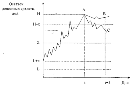 Модель Стоуна в отличии от модели Миллера-Орра больше внимания уделяет управлению целевым остатком, нежели его определению; вместе с тем оно во многом сходна с ней. Верхний и нижний пределы остатка средств на счете подлежат уточнению в зависимости от информации о денежных потоках. Так же как и в модели Миллера Орра Z представляет собой целевой остаток средств на счете, к которому компания стремится, а Н и L соответственно верхний и нижний пределы колебаний. Кроме указанных, модель Стоуна имеет внешний и внутренний контрольные лимиты: Н и L - внешние, а Н - L и L + х - внутренние. В отличие от модели Миллера-Орра, когда при достижении контрольных лимитов совершаются немедленные действия, в модели Стоуна это происходит не всегда.