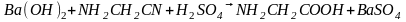 До киплячої суспензії 253 г. (0,8 мол.) гідроокису барію в 500 мл води, яка знаходиться в літровому стакані, додають частинами 61,6 г (0,4 мол.) кислої сірчаної кислоти аміноацетонітрила з такою швидкістю, щоб реакційна маса не пінилась занадто швидко та не виливалась з стакану. Потім на стакан ставлять літрову круглодонну колбу, через яку пропускають холодну водопровідну воду, і місткість стакана кип’ятять до тих пір, доки не зупиниться виділення аміаку; на це знадобиться 6–8 годин. Барій кількісно осаджують додаванням точно розрахованої кількості 50%-ї сірчаної кислоти. Фільтрат запарюють на водяній бані до об’єму 50–75 мл; по охолодженні випадають кристали гліцину, який відфільтровують. Фільтрат знову запарюють, охолоджують та знову відфільтровують кристали. Цей процес повторюють до тих пір, поки об’єм фільтрату не буде 5 мл. Вихід отриманого таким чином неочищеного гліцину буде 25–27 г. Його піддають систематичній перекристалізаціі з води, знебарвлюючи розчин вуглем; при цьому отримується продукт, який плавиться при 246° чи більше. Промивка всіх послідуючих порцій кристалів 50%-м етиловим спиртом слугує звільненню кристалів з маточника.