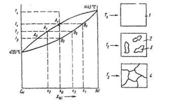 В найпростішому випадку ізобарну діаграму стану з утворенням змішаних кристалів заміщення й структури, що з'являються в процесі охолодження, можна представити у вигляді мал. 1: система Си(1083°С) - Ni(1445°C); Тх, Т1 Т2, Т3 - состав: х0, х3, х4(розплав); х1, х2, хо (змішані кристали).