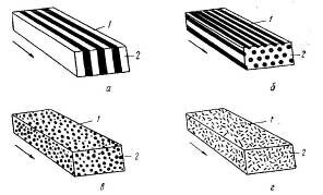 Характерним для евтектичних структур є особливе просторове розташування чистих компонентів. Відповідно розподілу обох твердих фаз розрізняють, наприклад, пластинчасті, кульові (глобулярні), стержнеподібні або голчасті евтектичні структури. Найважливіші евтектичні структури показані на мал. 8.