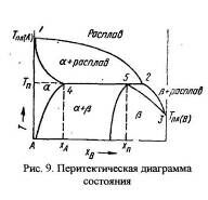 У результаті виходить зображена на мал. 9 діаграма стану з позначеними на ній областями існування різних фаз, причому Гп і хп є відповідно перитектичними температурою й составом. У перитектичній крапці в рівновазі перебувають чотири фази: розплав, кристали
