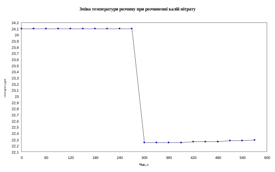 Для розрахунку точної зміни температури на міліметровому папері побудувати графік, відкладаючи по вісі абсцис час, а по вісі ординат– зміну температури (масштаб на абсцисі- 1хв: 1см, а на ординаті– 1°К: 5см). З’єднані точки дадуть дві нахилені прямі для попереднього та заключного періодів. Їх продовжити вправо та вліво відповідно і через середину головного періоду провести пряму, паралельну до вісі ординат, до перетину її з продовженнями попередніх прямих. Відстань між точками перетину відповідає зміні температури при розчиненні солі.
