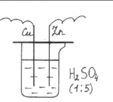 Ход работы: В пробирку на 1/3 объема наливают раствор серной кислоты и помещают одну гранулу цинка. Наблюдают выделение газа водорода. Далее дотрагиваются до цинка медной проволокой. Реакция идет более энергично, выделяются более крупные пузырьки газа. Написать соответствующие уравнения реакций, объяснить наблюдаемые явления.