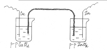 4. Оборудование и реактивы: Два химических стакана, медный и цинковый электроды, марлевый жгутик, гальванометр, растворы хлорида меди и хлорида цинка (10 %.)