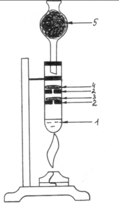 Ход работы: В пробирку (рис. 2.) наливаем свежеприготовленной хлорной воды (1). Вставляем в пробирку приготовленные резиновые кружочки- держатели (2) с отверстиями. В первый помещаем слой ваты, смоченный раствором KI и крахмала (3), во второй – слой ваты, смоченный раствором KBr (4). Закрываем пробирку хлоркальциевой трубкой, заполненной углем (5). Подогреваем хлорную воду в пробирке. Выделяющийся хлор реагирует с растворами KI и KBr. Наблюдается изменение окраски: слой ваты с бромидом калия приобретает красновато–коричневый цвет, вата с иодидом калия – синеет: 2KBr + Cl2 2KCl + Br2, 2KI + Cl2 2KCl + I2.