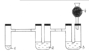 Ход работы: Собирают прибор согласно рис. 3. Установка должна быть герметичной. В пробирку Вюрца (1) помещают одну или две ложечки для сжигания кристаллического KMnO4 и соляную кислоту (конц.), немного превышающую уровень соли. Пробирку быстро закрывают пробкой. Выделяющийся хлор проходит сквозь толщу раствора KI в первой U-образной трубке (2). Наблюдают появление коричневой окраски и образование темно- фиолетовых кристаллов. Далее хлор проходит через раствор KBr во второй U–образной трубке (3), окисляя анион брома соли. Раствор приобретает красновато-бурый цвет. Излишки хлора поглощаются активированным углем в хлоркальциевой трубке (4). Закончив опыт, установку переносят в вытяжной шкаф, где проводят утилизацию растворов.