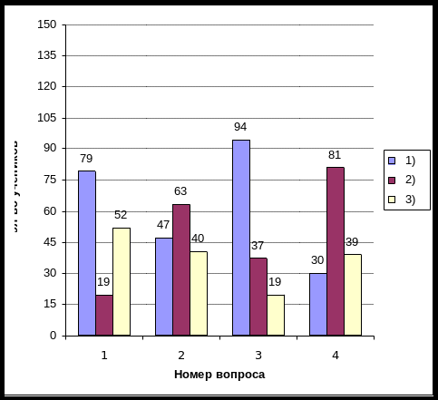 Следующий опрос был проведен среди учащихся 5-11 классов (всего опрошено 150 человек). К каждому из четырех вопросов было предложено три варианта ответа. Результаты этого опроса представлены в диаграмме (рис.1).