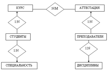 В направлении СТУДЕНТЫ получают АТТЕСТАЦИЯ устанавливаем связь N:M так, как один студент может получает много аттестаций по разным дисциплинам; и много студентов получают одну аттестацию по одой дисциплине.