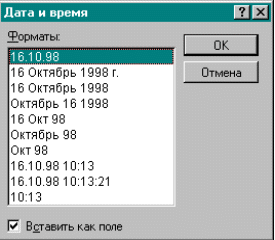 2. В меню Вставка (Insert) выберите команду Дата и Время (Date and Time). Появится диалоговое окно Дата и Время (Date and Time).