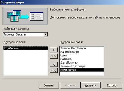 На первой странице мастера выбираю все поля таблицы Товары и все поля, исключая КодФирмы, таблицы Заказы и нажимаю кнопку Далее.