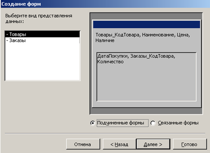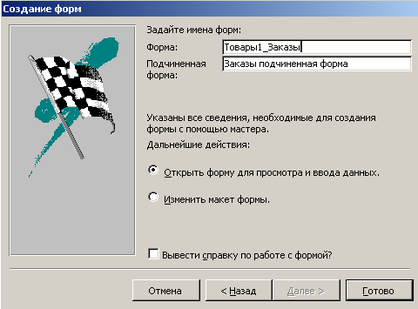На последней странице Мастера указать имя формы «Товары1_Заказы». Нажать кнопку ГОТОВО.