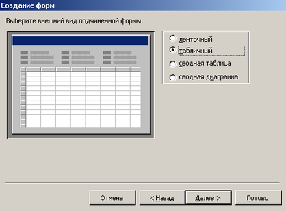На третьей странице Мастера выбрать внешний вид подчинённой формы Табличный.