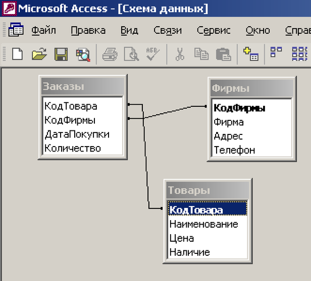 11) Создаю первичные ключи в таблице Товары (поле КодТовара) и в таблице Фирмы (поле КодФирмы). Делаю схему данных из таблиц Товары, Фирмы, Заказы и устанавливаю между ними связь: