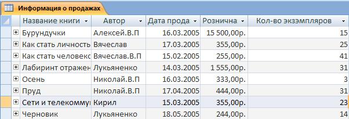 В базе данных книжного магазина необходимо хранить информацию о поступивших в продажу книгах: название книги, автор, издательство, годы выпуска, область знаний, цена издательства за экземпляр. База данных также должна содержать информацию о продажах: название книги, дата продажи , розничная цена за один экземпляр, кол-во экземпляров.