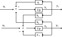 В данной лабораторной работе средствами пакета Matlab (c использованием его расширения – пакета моделирования динамических систем Simulink) должно быть выполнено моделирование линейной системы, зафиксированы процессы, соответствующие элементам матричной весовой и переходной функций и проведено их сравнение с аналитически полученными зависимостями. Структурная схема системы представлена на рис. 1.1, коэффициенты структурной схемы в табл. 1.1. Номер варианта для бригады указывается преподавателем.