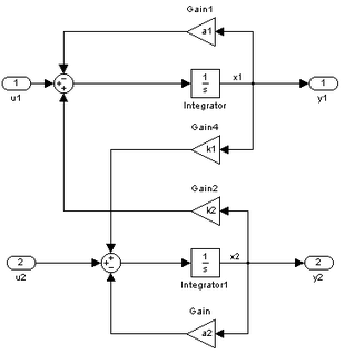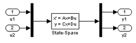 Промоделировать систему, описанную в векторно-матричной форме, позволяет блок State-Space раздела Continuous основной библиотеки блоков Simulink. Структурная схема системы также может быть создана на основе блоков этой же библиотеки. Начальные условия следует принять нулевыми. Полученные структуры рекомендуется объединить в подсистемы, выделив все их элементы и выполнив команду Create Subsystem меню Edit или нажав на сочетание клавиш Ctrl+G.