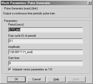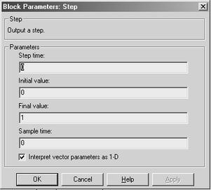 При организации источника входного воздействия (единичной или дельта-функции) следует использовать блоки Step и Pulse Generator раздела Sources. Обратите внимание на то, что необходимо подобрать длительность входного импульса, который бы воспринимался системой как дельта-функция (площадь импульса должна быть равна 1), т.е. значение длительности должно быть таким, чтобы его уменьшение уже не приводило к изменению отклика системы.